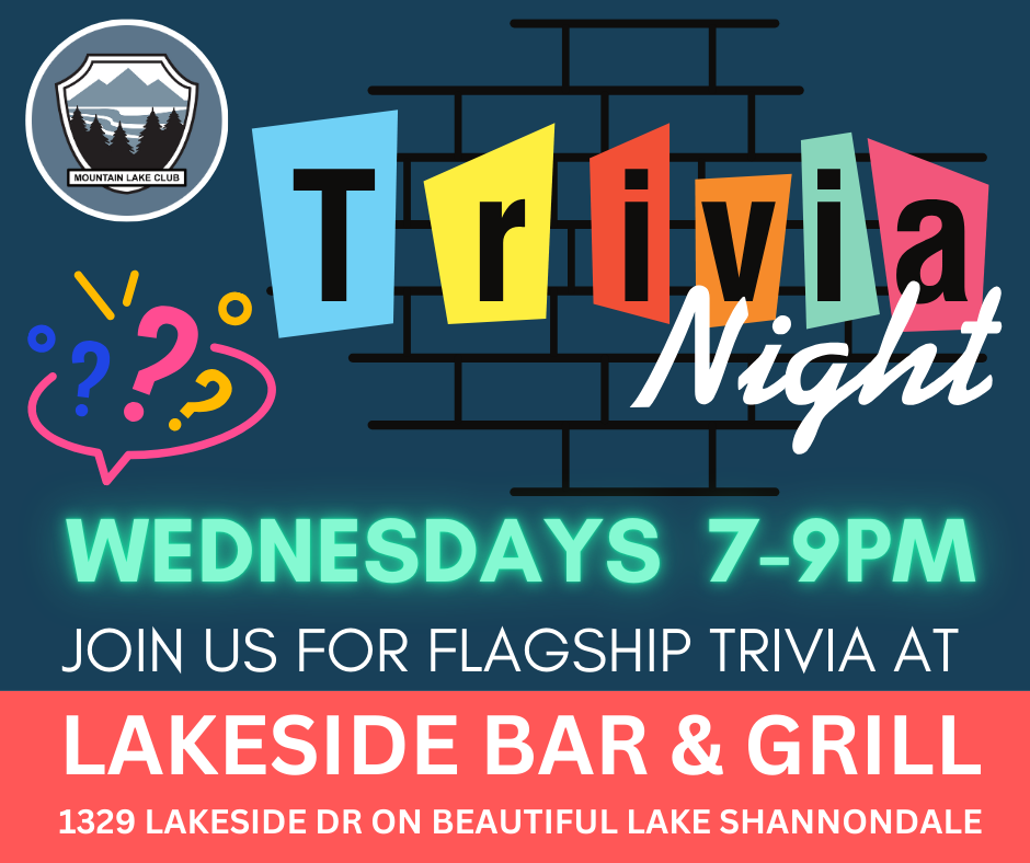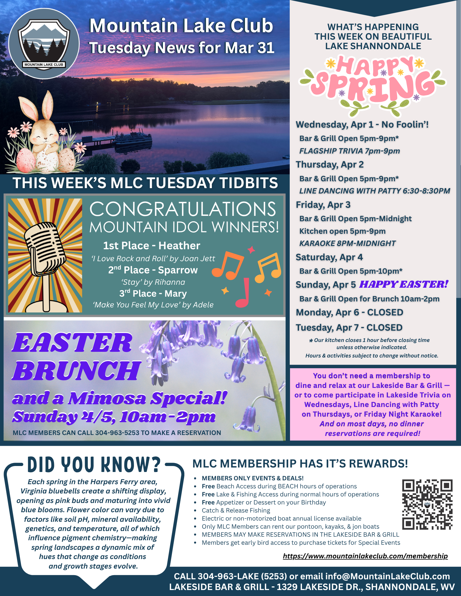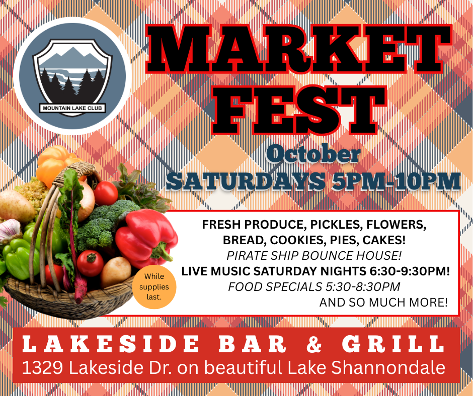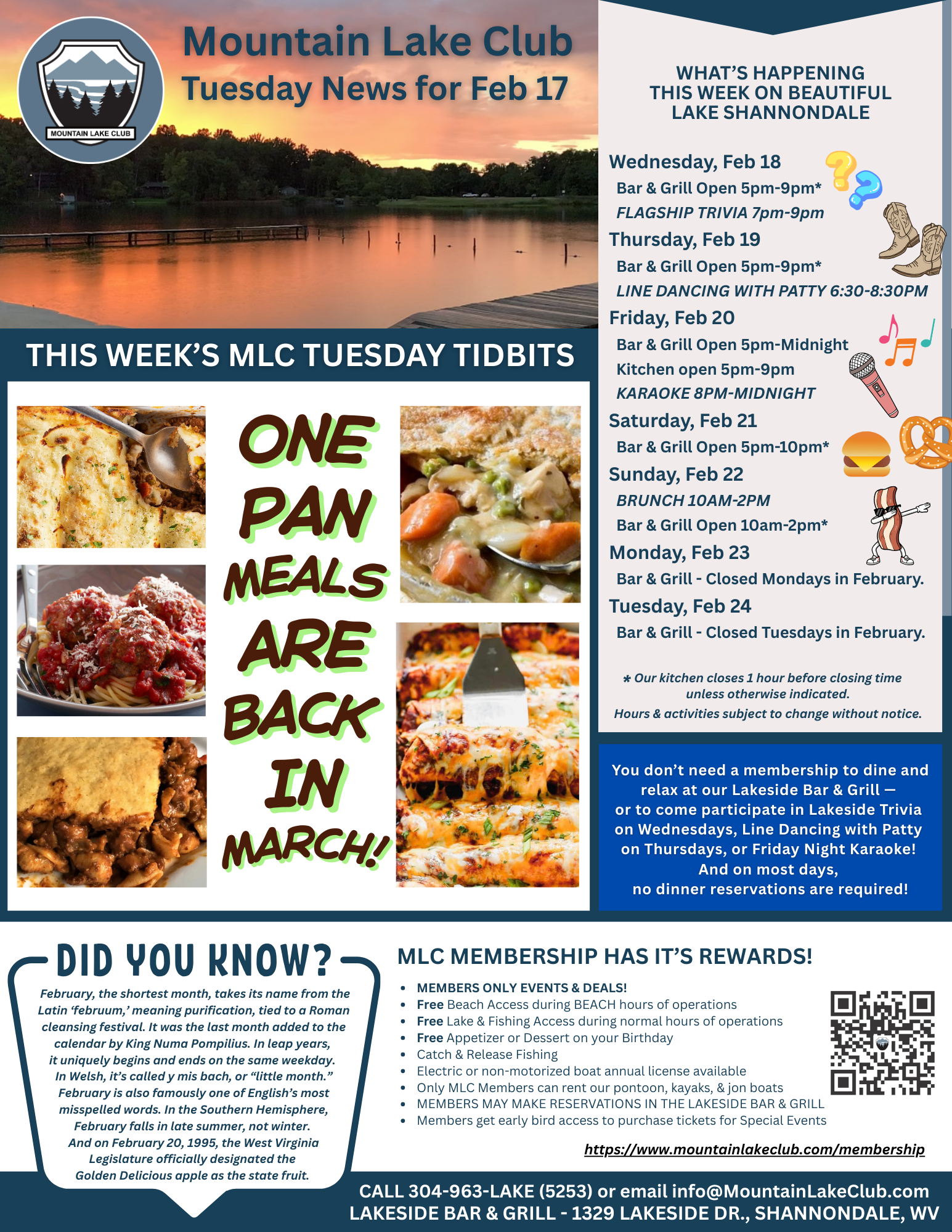 Events held at Mountain Lake Club may either be inside Lakeside Bar & Grill (LB&G) or outside on the property. Most events are open to the public, but some events may be for MLC members only and will be advertised as such. Please note, events are subject to change or cancellation without prior notice, and dates, times, and details may vary.